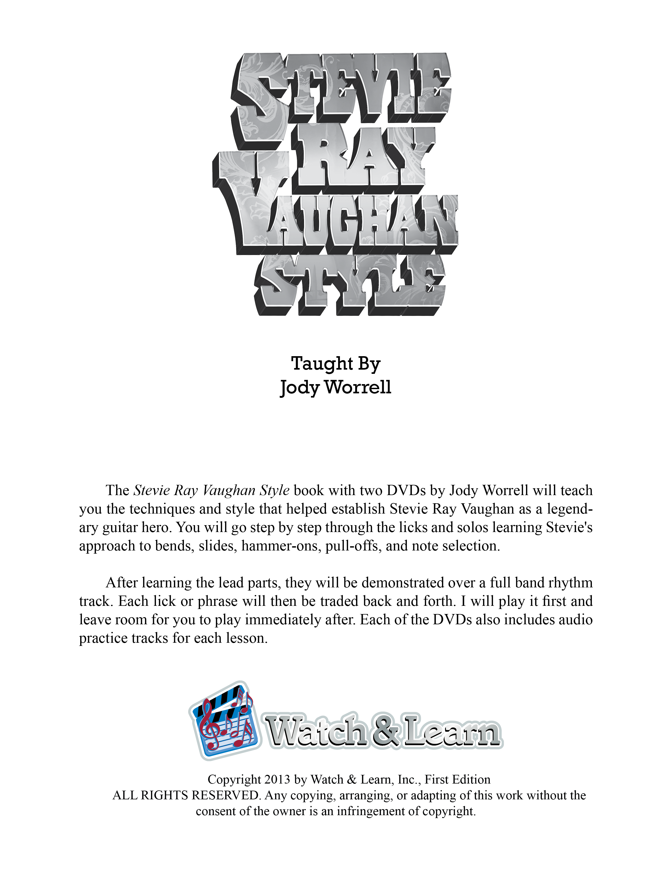 The Stevie Ray Vaughan Style Book with 2 DVDs by Jody Worrell touches on the techniques and style that helped establish Stevie Ray Vaughan as a legitimate guitar hero. Jody will take you step by step through licks and solos teaching Stevie’s approach to bends, slurs, hammer ons, pull offs, and note selection. After teaching you the lead parts, Jody will demonstrate them over a rhythm track. The included lessons are Stevie Ray Style Licks in A 1 & 2, Stevie Ray Swing Solos 1 & 2, and Stevie Ray Minor Solos 1 & 2. Package includes guitar tabs, 151 minutes of video instruction, and audio jam tracks.